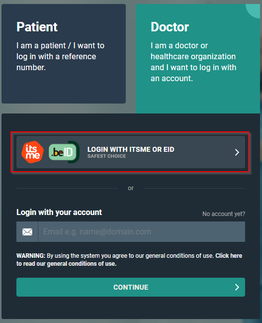 1. Click I am a doctor or healthcare organization and I want to log in with an account. Then click Login with Itsme of eID.