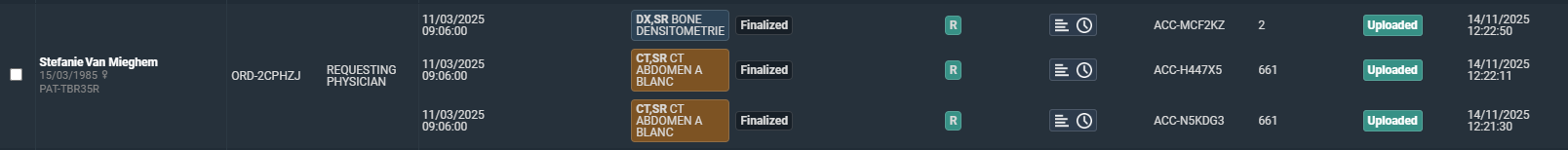 If multiple studies linked to different orders are uploaded for the same patient in one session, they are not grouped but listed as different orders with one patient ID. One patient, different studies linked to the same order If multiple studies linked to the same order are uploaded for the same patient in one session, they are grouped together and displayed as a single order with one patient ID. |